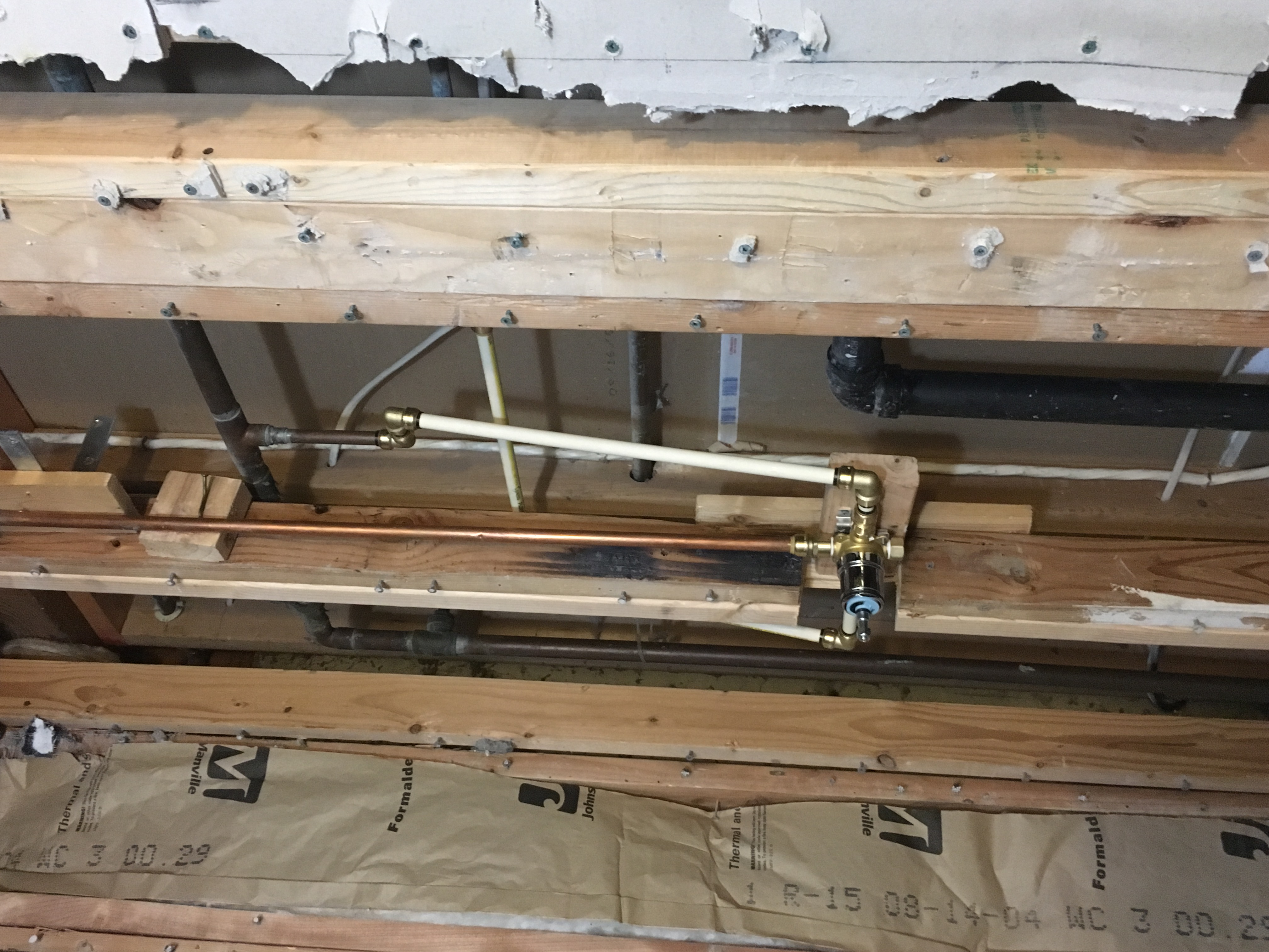 Upon purchase of our home, we discovered that the hot water and cold water were backwards in this particular shower. Since the walls were open, we decided to have the restoration company correct this issue while they were already there, at our expense. We felt that insurance would cover it under the same “code violation” that covered the rest of what was found, but your contractors refused to contact our insurance company and ask. We felt pressured into making a decision then and there due to time and ended up paying $900 for something that might have been covered. Worse still, the piping was installed with the wrong height, something we wouldn’t discover until the tile went in.