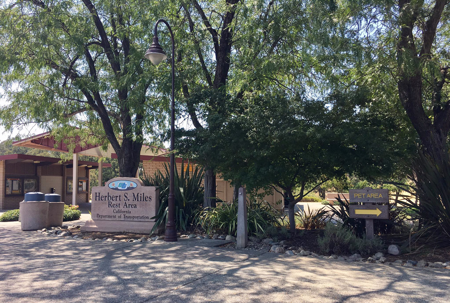 After crossing the border (and being stopped to ensure we weren’t bringing any produce or plants into the state), we drove up and down mountains in California. We stopped at a brief rest stop (pictures below) where you can see that the smoke cleared up a bit.